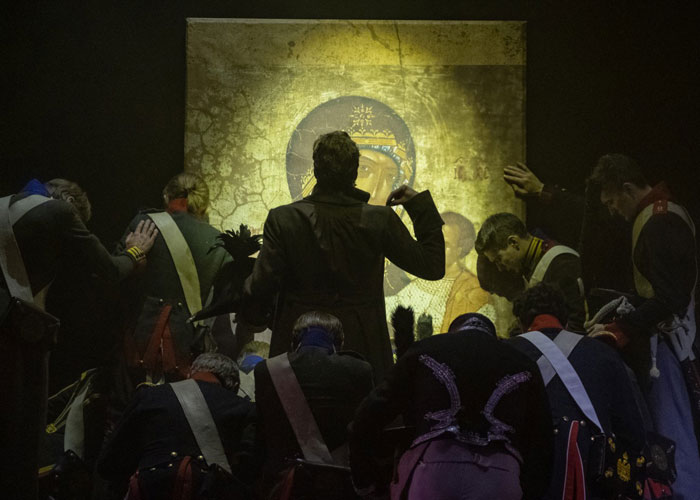 В спектакле задействована вся труппа театра, а также приглашенные актеры. Всего на сцену выйдут около семидесяти человек, в том числе знаменитый Хор имени Свешникова под руководством художественного руководителя и главного дирижёра - народного артиста России, профессора Геннадия Дмитряка, который на протяжении всего действия исполнит проникновенные песни, православные духовные песнопения, а также композиции западноевропейской музыки.